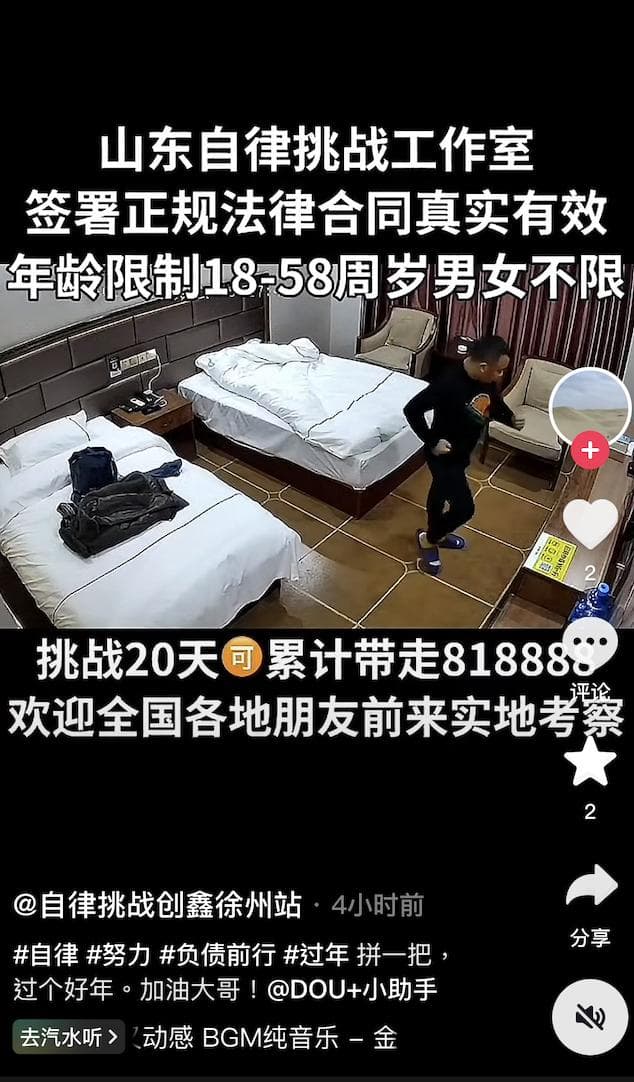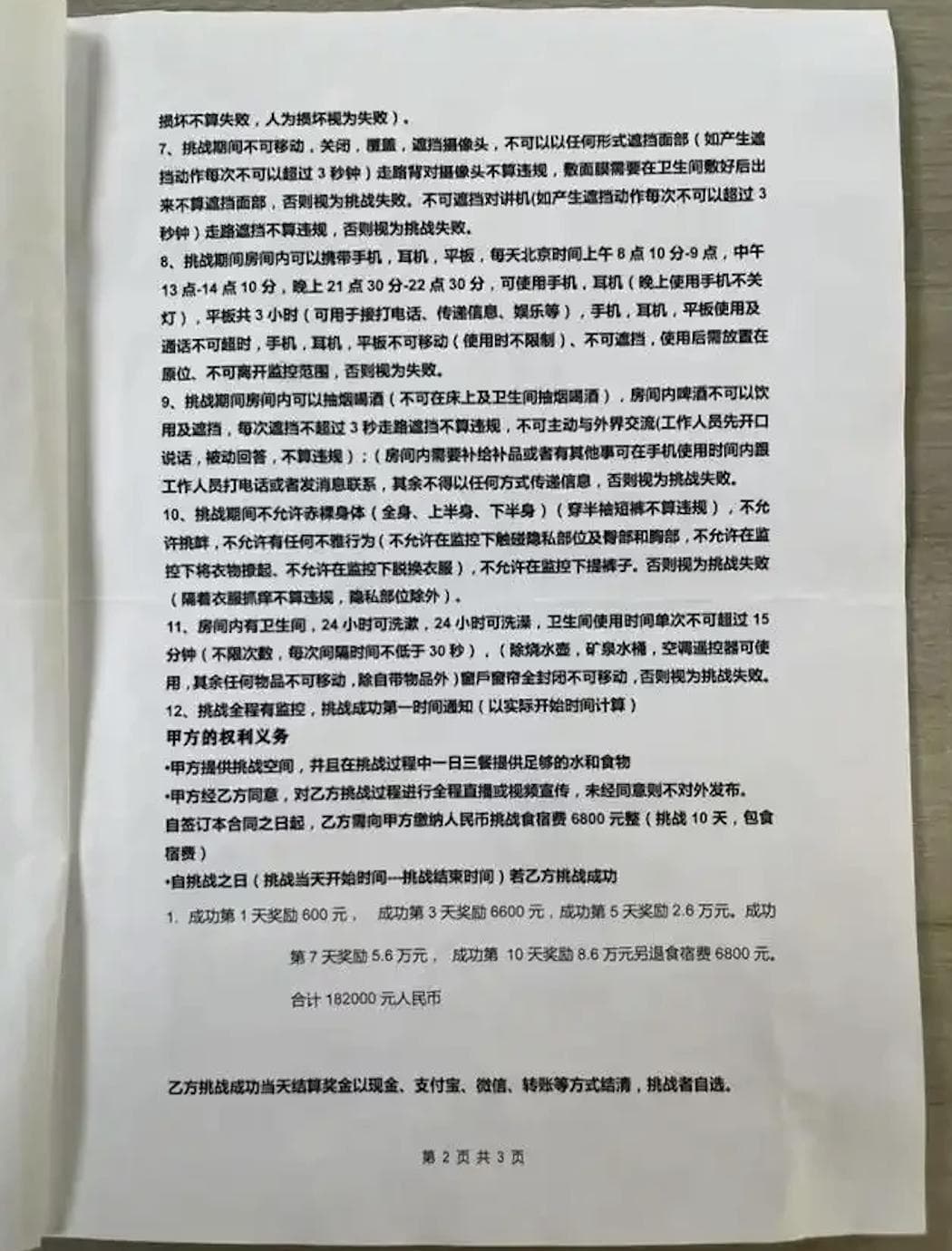 通过微信后,对方给张先生发了一份《自律挑战26天》协议书,挑战期间食宿由主办方提供,但要全程录像,协议书里还明确写着自律挑战成功后的具体奖金:挑战成功第3天奖励6800元,第6天奖励2.8万元,第9天奖励5.8万元,挺到第26天将累计奖励85.97万元。