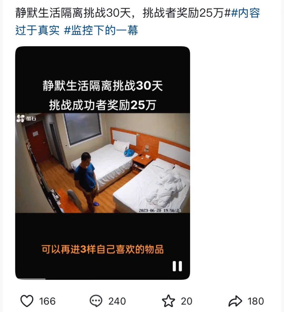 事实上,类似的挑战并不罕见,“隔离挑战”、“禁闭挑战”、“寂寞挑战”,名头换一下,规则大同小异,几千的报名费,几天到几个月不等的挑战时间,奖金金额从几万到数十万元。