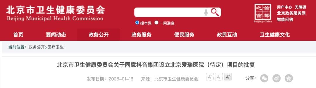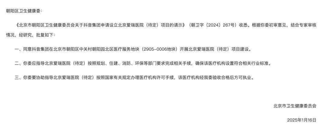 投资机获悉,日前北京市卫生健康委员会官网发布《关于同意抖音集团设立北京爱瑞医院(待定)项目的批复》的通知,并予以相关指导要求。