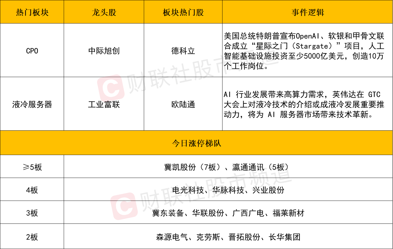 板块上,AI硬件算力方向全天强势,CPO、铜高速连接、PCB概念股涨居前,华脉科技、新亚电子、广合科技、汇源通信涨停,胜蓝股份、新易盛、生益电子、方正科技、生益科技等个股涨幅居前。美国总统特朗普宣布OpenAI、软银和甲骨文联合成立“星际之门(Stargate)”项目,人工智能基础设施投资至少5000亿美元,创造10万个工作岗位。