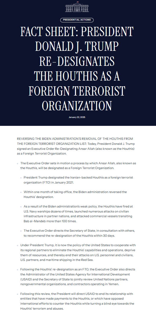 最后,白宫还表示,在这项审查之后,总统将指示美国国际开发署终止与那些向胡塞武装提供资金或反对国际社会打击胡塞武装的努力、同时对胡塞武装的恐怖主义和暴行视而不见的实体之间的关系。