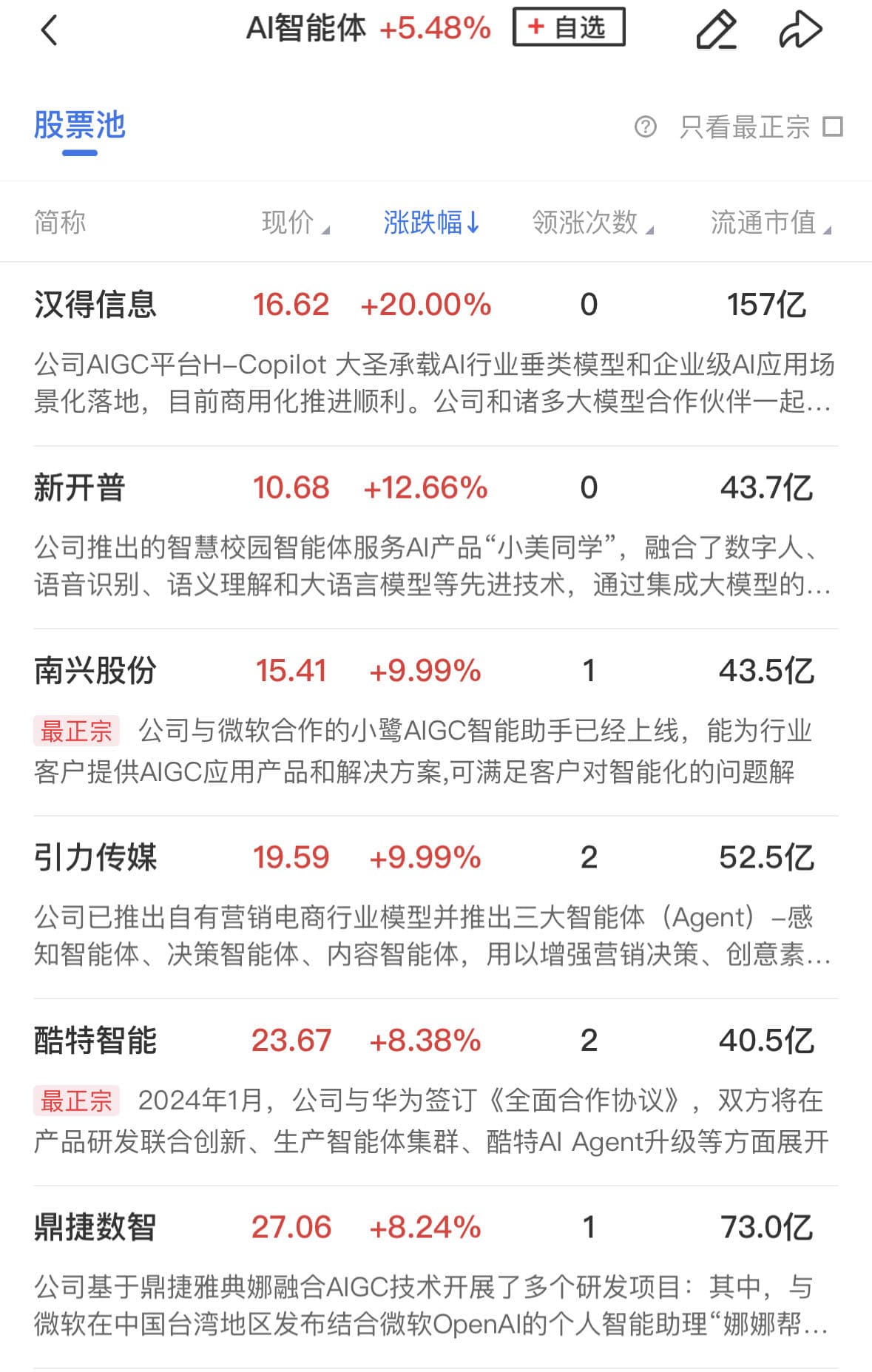 AI智能体概念走强,汉得信息、南兴股份、引力传媒涨停,新开普、凌云光、酷特智能、金财互联的等个股涨幅居前。消息面上,OpenAI首席产品官凯文・维尔表示,OpenAI预计将在2月或3月发布更智能的GPT o3模型。他还提到,公司准备在第一季度推出其首批AI智能体工具,使ChatGPT能够在计算机上执行实际操作。