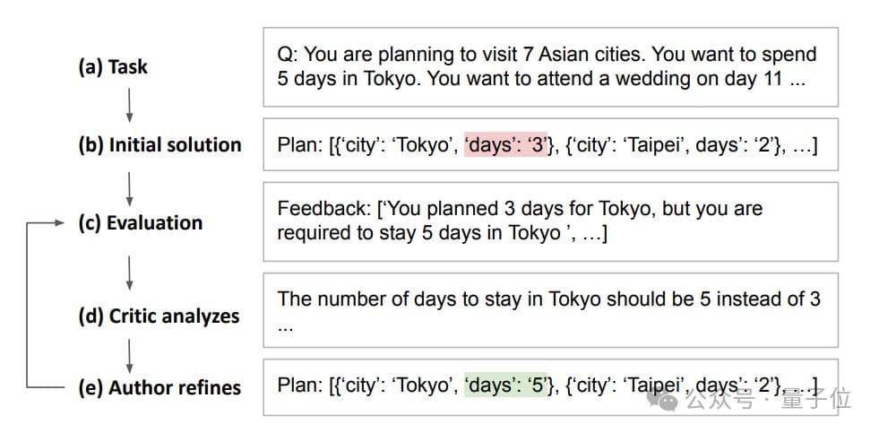 评估(Evaluate):对生成的解决方案给出反馈,指出问题,如成本超出预算限制、用餐偏好未满足等;