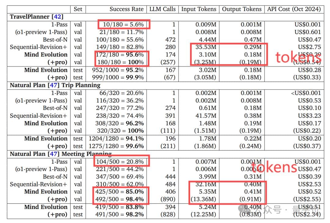 在TravelPlanner(评估旅行规划)和Natural Plan(评估会议规划)这两项基准测试中,未采用Mind Evolution的Gemini 1.5 Flash任务成功率分别为5.6%和20.8%,而采用Mind Evolution之后,其任务成功率分别提升至95.6%和85.0%。