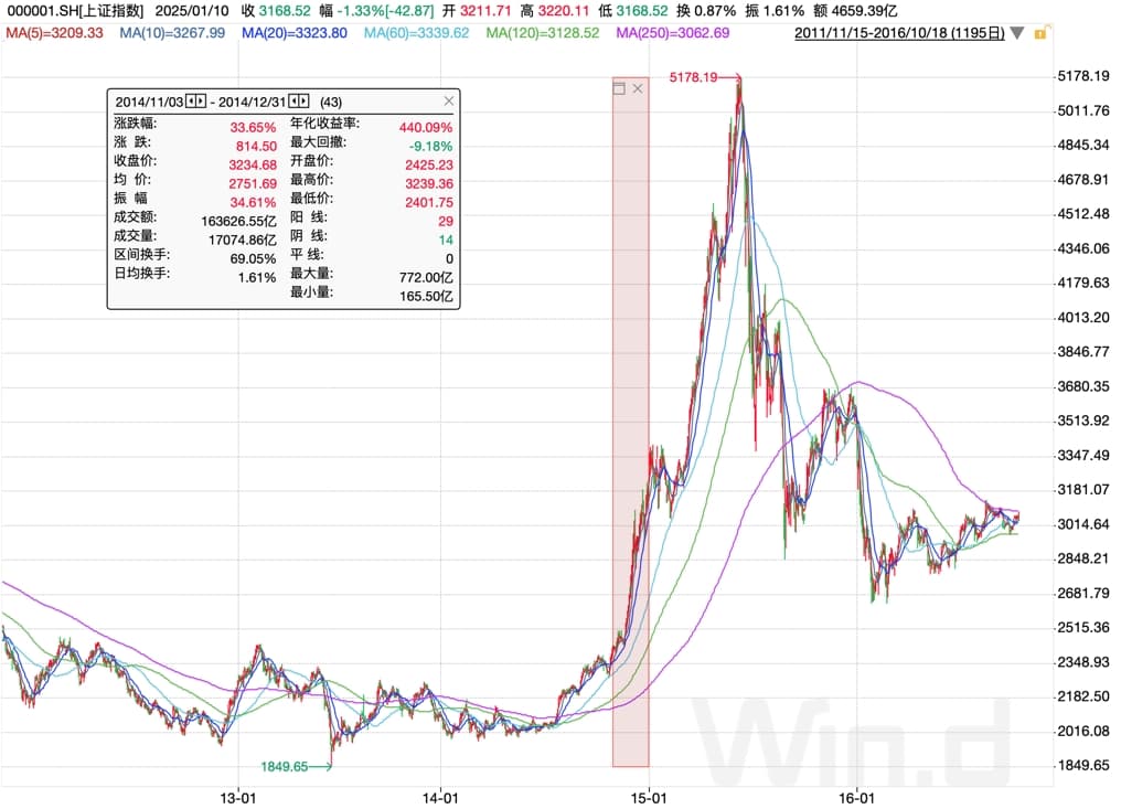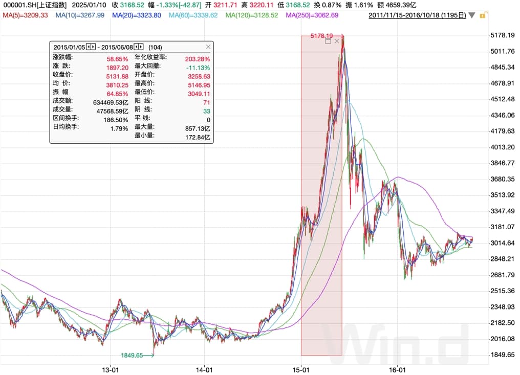 来到2015年,A股牛市进入第三阶段,上证指数从年初的约3300点附近一路上攻,以6月中旬站上5178.19点高位作为本轮牛市的终点。