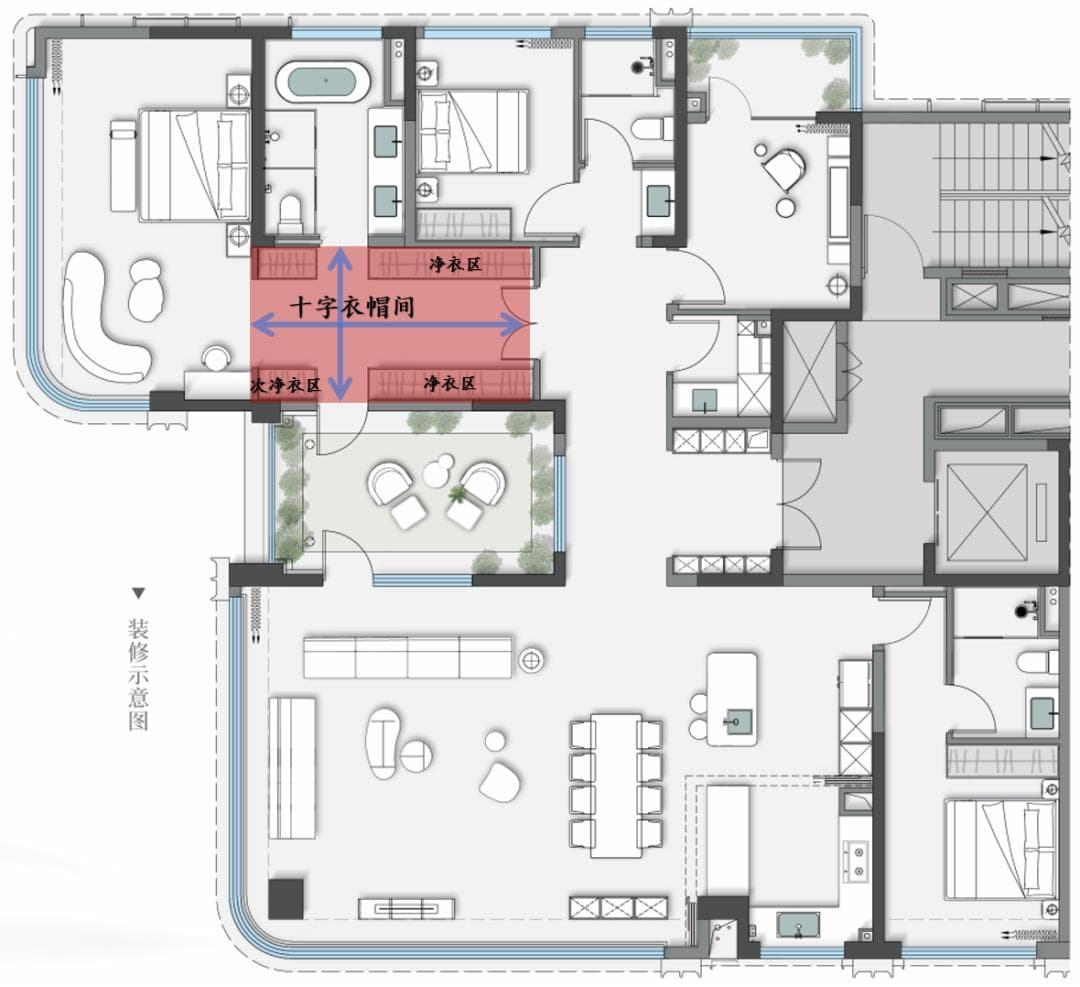 而且,同样是做衣帽间的分区,金茂·璞逸锦江还做出净衣和次净衣的分区。