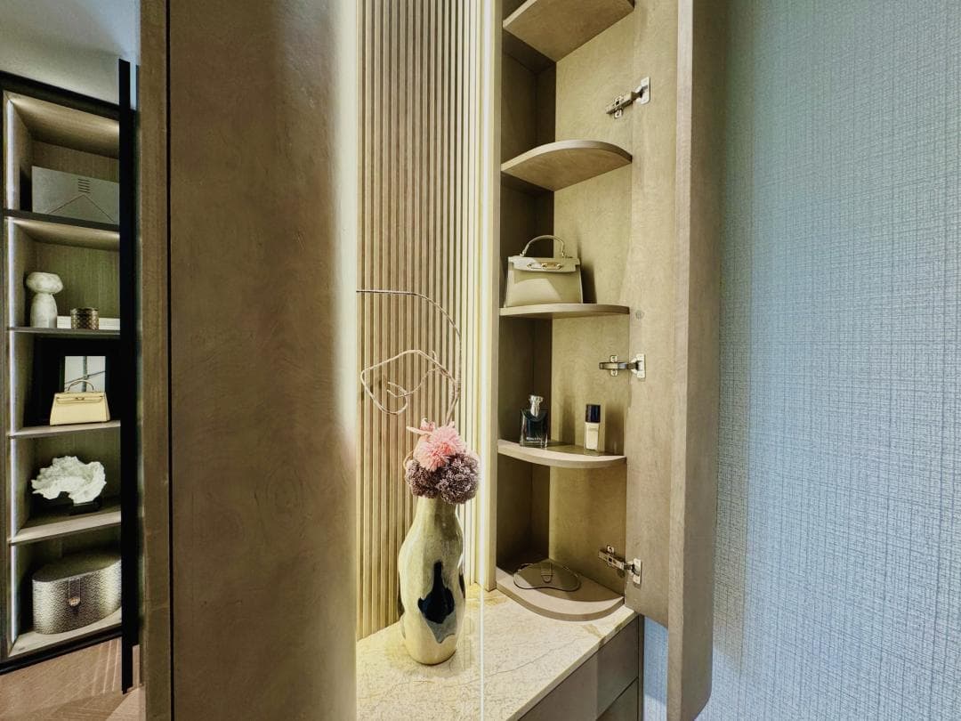 打开壁龛后,还暗藏了一个完整的收纳空间。用于放置主人日常用的首饰、皮包等装饰品。