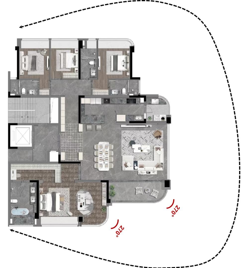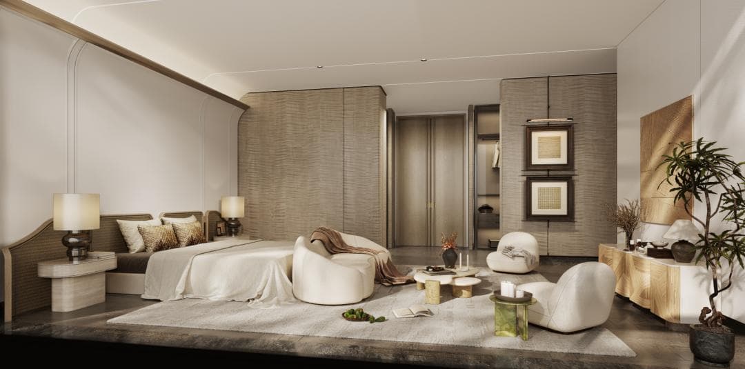 好的观景视野还会给主卧带来意想不到的情绪价值,本质上是因为开发商开始认同两件事。第一,主卧不仅仅是一个睡觉的场所。第二,豪宅的主卧也不仅仅是面积的一味放大。