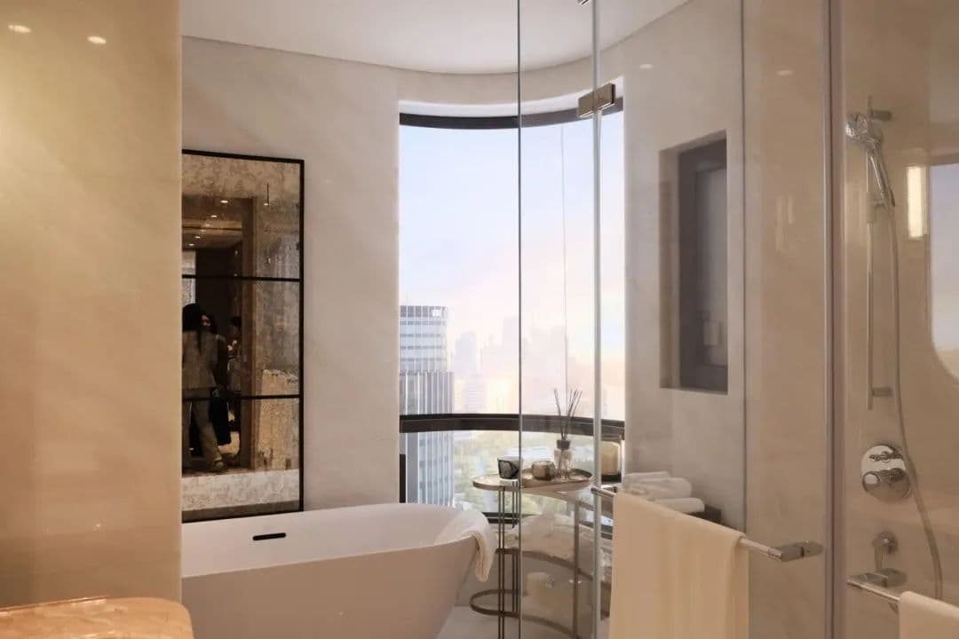 哪怕是在卫生间,也可以充分感受到被江景包裹的生活体验,卫生间的角窗特意凸出外墙,并且也被做成曲线。