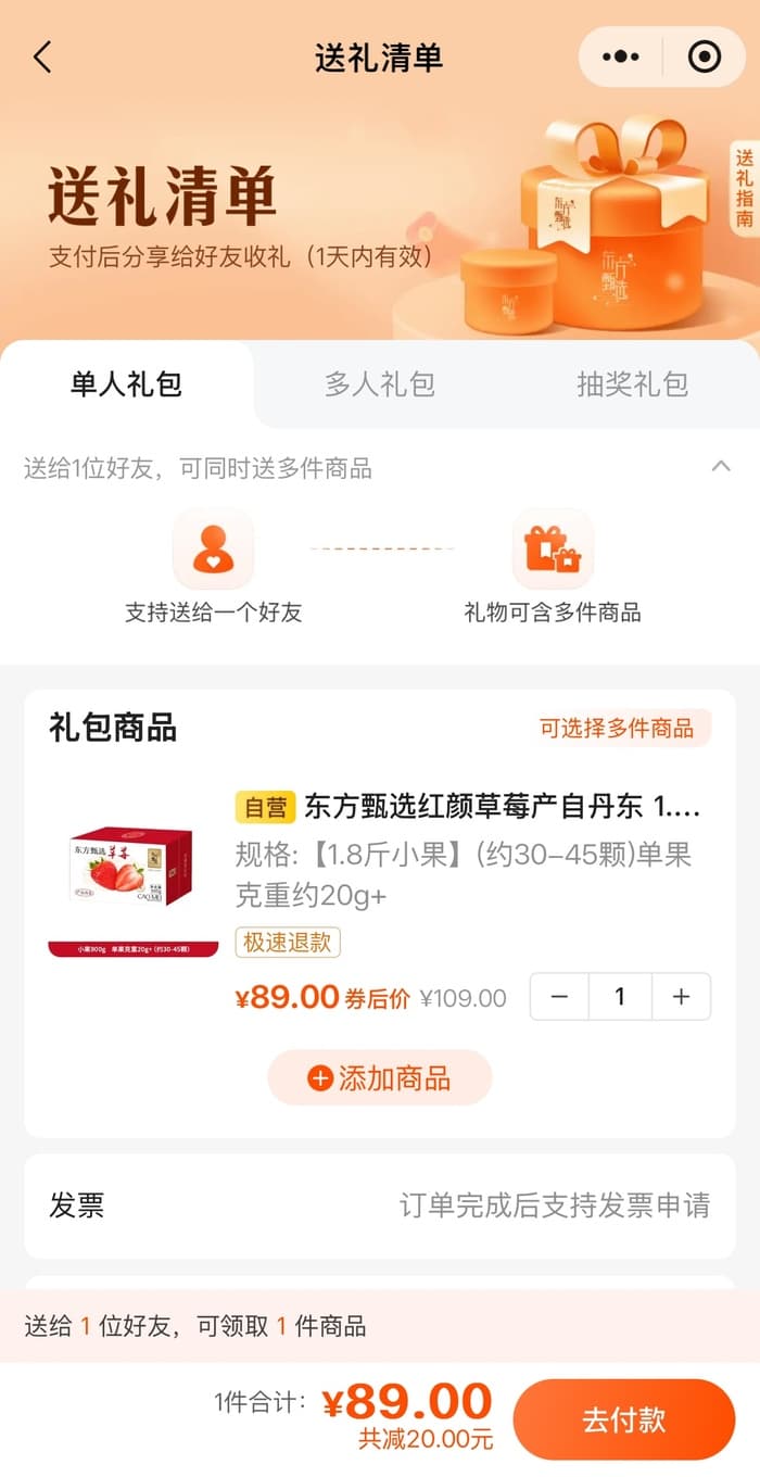 在送礼物上线之前,东方甄选已在微信小店渠道持续投入,例如微信小店开店、东方甄选大部分自营产品上架及运营等。上述人士称,因此在送礼物功能上线后,东方甄选节省了很长的开店周期和上品运营准备工作周期。今年1月7日,东方甄选APP也上线了送礼物功能,同时加入了“多人礼包”和“抽奖礼包”等玩法,增加购买场景。