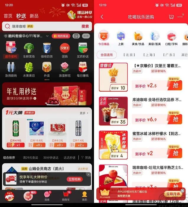 继餐饮外卖后外,京东方面似乎又盯上了团购。近日京东App秒送专区上线团购频道,用户可在其中购买瑞幸、库迪、霸王茶姬,汉堡王、达美乐等知名茶咖和餐饮品牌的优惠券,再到店核销。