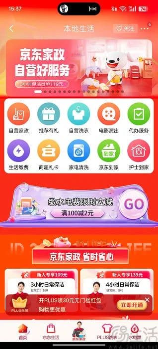 此外,京东App首页还上线了本地生活、京东旅行等频道,其中本地生活频道提供有家政、洗衣、家电清洗、代办、电影演出、生活缴费等服务。而且值得一提的是,日前京东家政方面还发布了“百县十万人招募计划”,面向百县千镇招募10万保洁师。