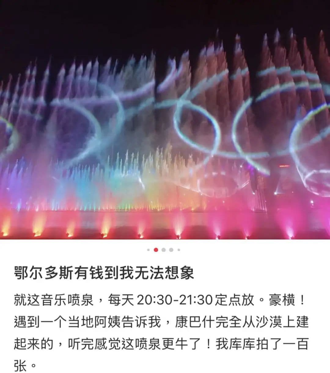 “全亚洲最大康巴什喷泉广场,完全从沙漠上建起来的,每天定点放,开了眼了。”