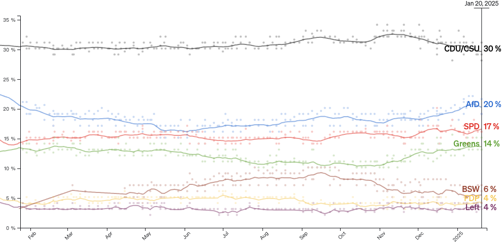 根据本周出炉的民调,基民盟依然以30%左右的支持率领跑,另类选择党的支持率维持在20%。考虑到几乎没有政党会与选择党结盟,所以下届德国政府最有可能的构成依然是默茨领导的联合政府。