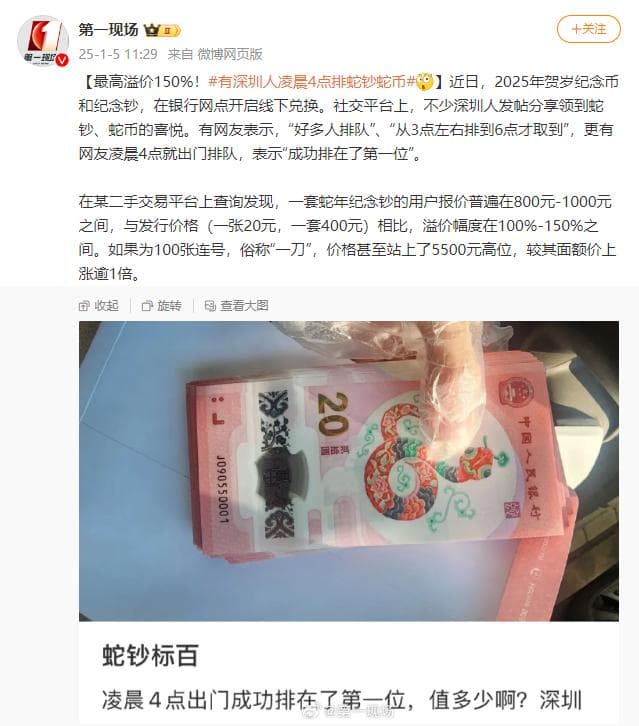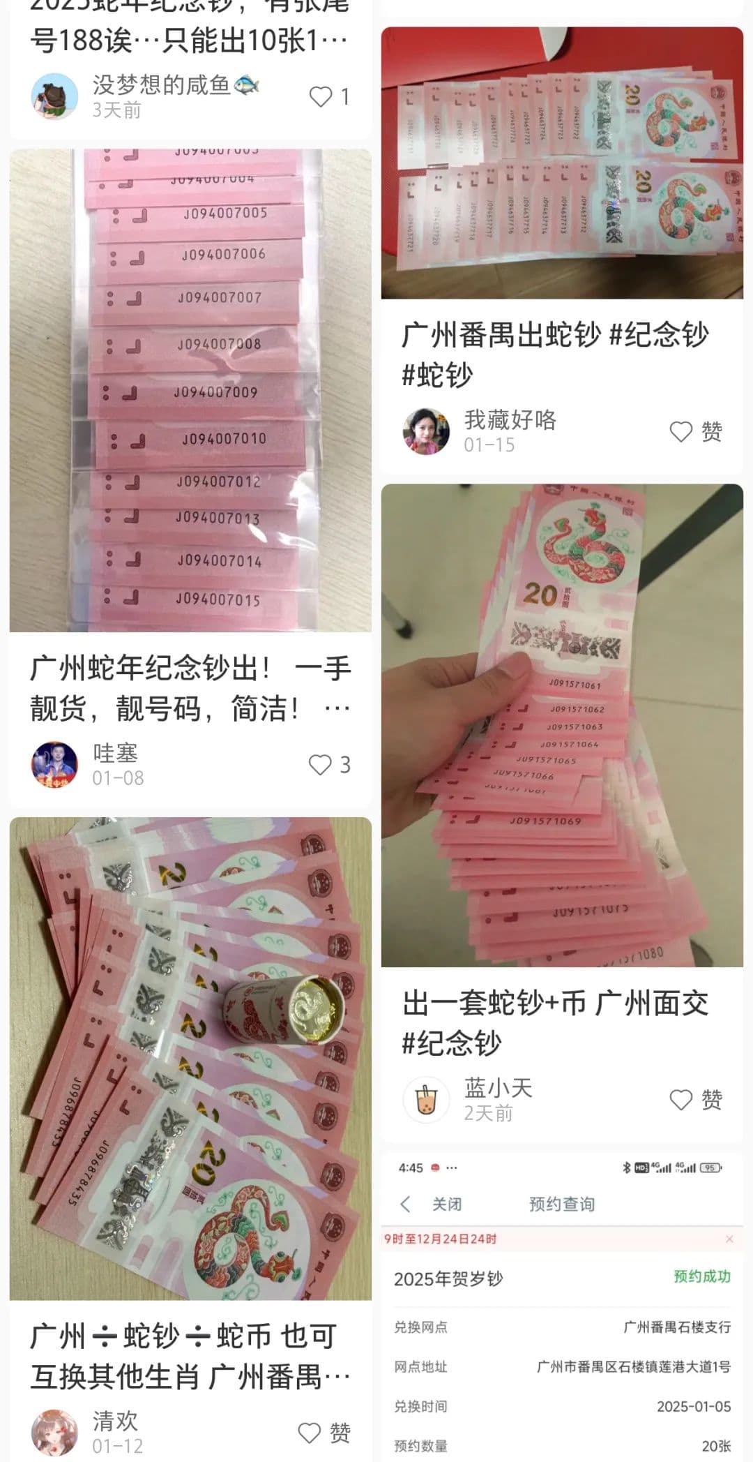 但这并不影响如愿拿到实物的人的分享欲。随着第一批幸运儿走出银行并第一时间分享,“蛇钞”话题再一次冲上热搜榜。有人兴奋地展示自己拿到的三连号纪念钞,评论区立刻出现一片羡慕之声,当然也少不了二手币商和“黄牛”的询问:“出吗?”