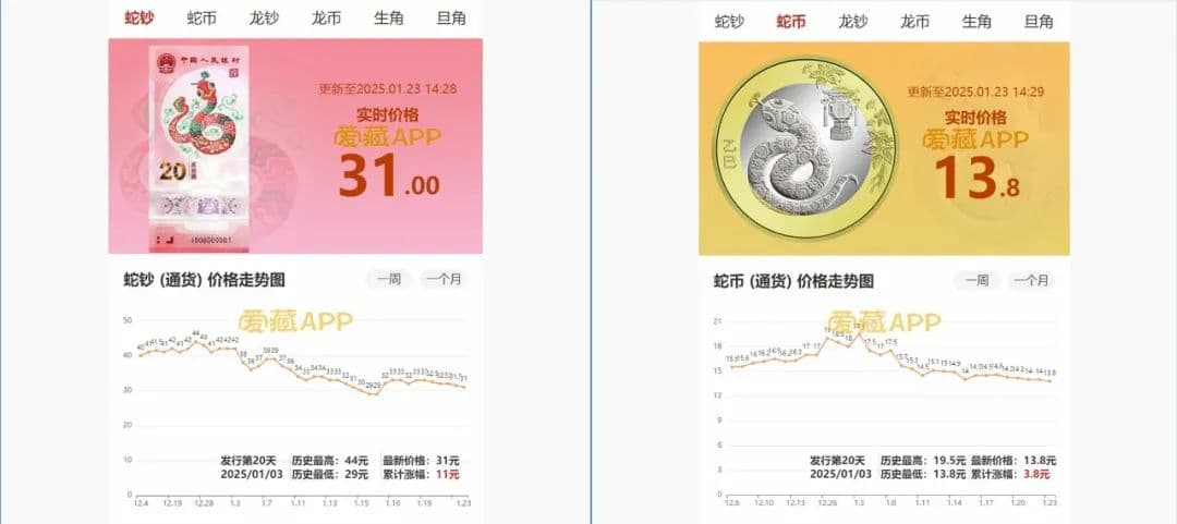 爱藏App实时价格显示,单张蛇钞的通货价格曾达到44元的历史巅峰,但很快伴随着兑换进程逐步走低,目前为31元。而蛇币的走势也不乐观,单枚价格虽然在开启兑换当天达到19.5元的高价,但之后便一路下滑,在二手市场的价格不到14元。