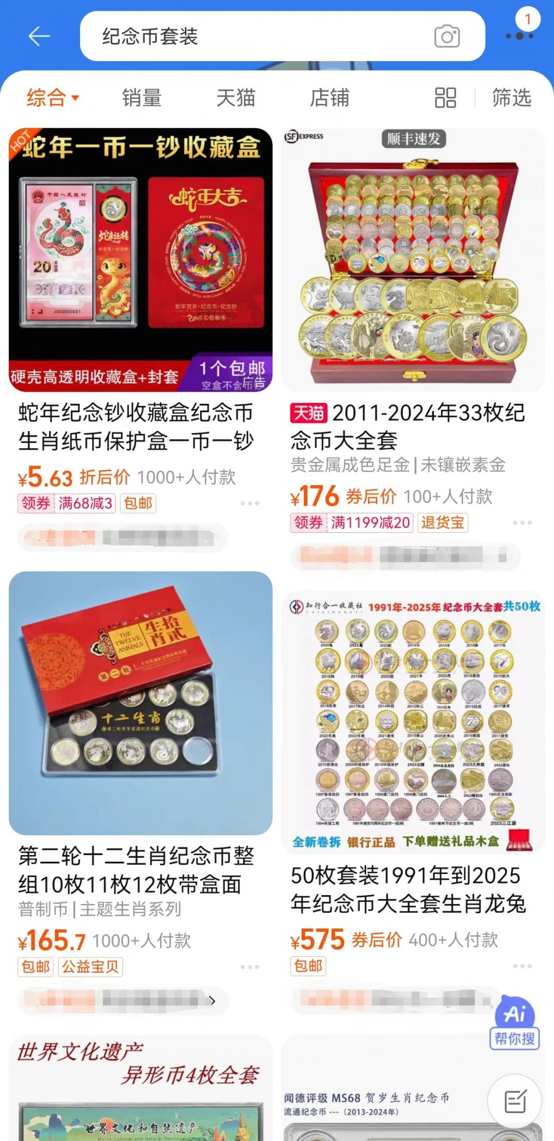线上购物平台里,搜素“纪念币套装”便会出现价格不一的装帧版。(图/淘宝截图)