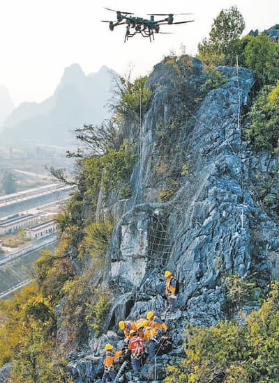 黔桂铁路一处沿线山体上,国铁南宁局柳州工务段桥隧工用无人机运输的材料整治危石。