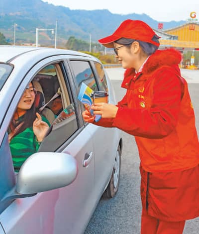 呼北高速广西梧州蒙山西高速出入口服务点,志愿者为旅客送上春节礼物。