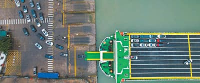 海南海口市秀英港,车辆排队驶入新能源车专用运输船“绿源二号”。