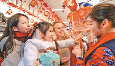 在北京西站开往郑州东站的G97次列车上,国铁郑州局工作人员组织各式“迎新春”特色活动,让乘客在旅途中感受春节的美好氛围。