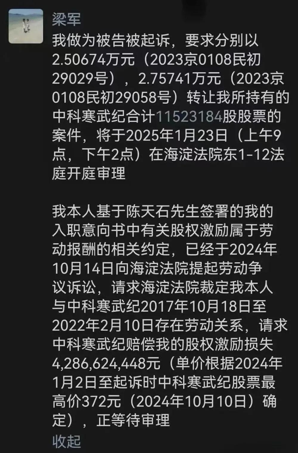 1月22日,寒武纪前CTO梁军在朋友圈发声,称他作为被告被起诉,要求其分别以2.51万元、2.76万元转让所持有的寒武纪约1152万股股票。同时,梁军于2024年10月14日发起劳动诉讼,要求寒武纪赔偿以2024年10月10日股价高点372元计算的、42.87亿元股权激励损失。