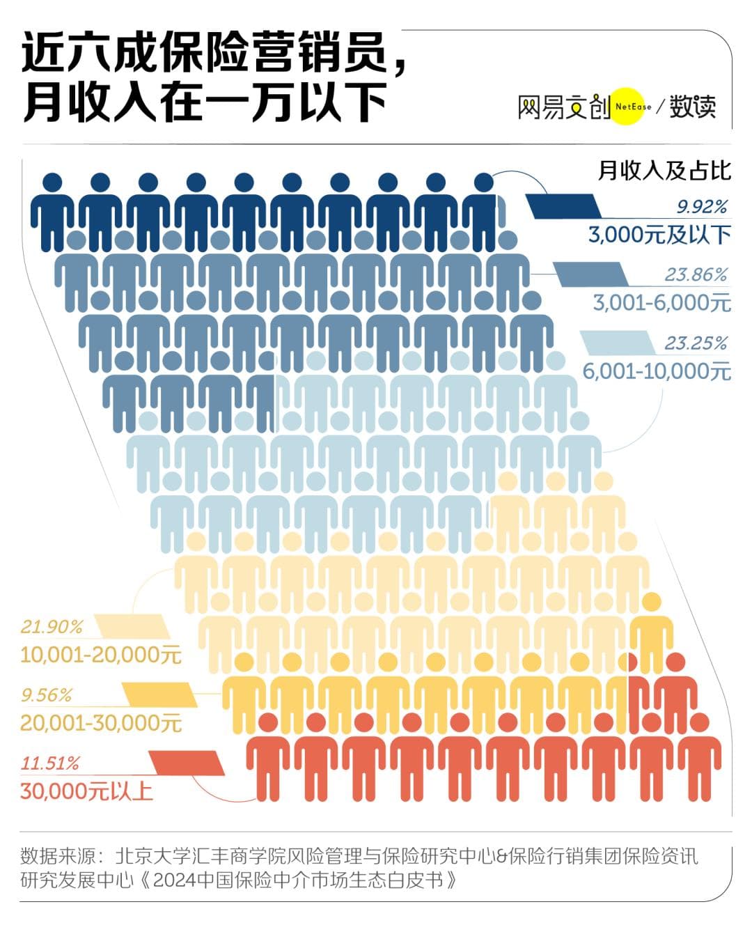 《2024 中国保险中介市场生态白皮书》就显示,尽管有大概两成保险营销员的月收入超过两万元,但总体来看,仍然是 3001 元至 6000 元这个收入区间的人群占比最高,差不多接近四分之一。