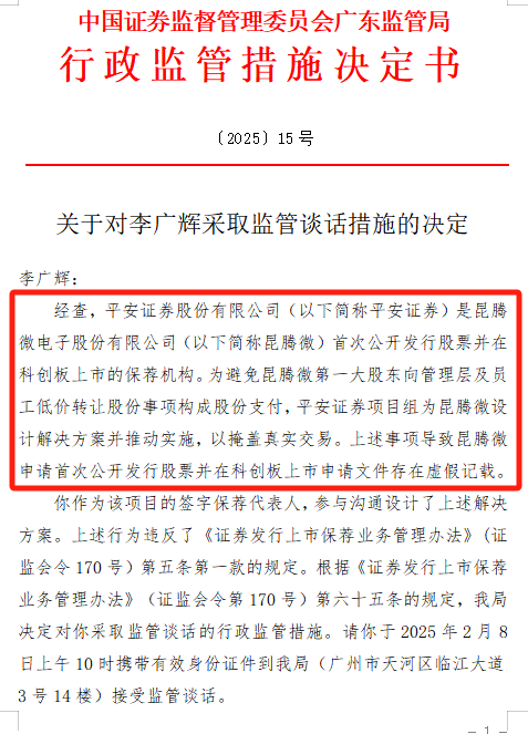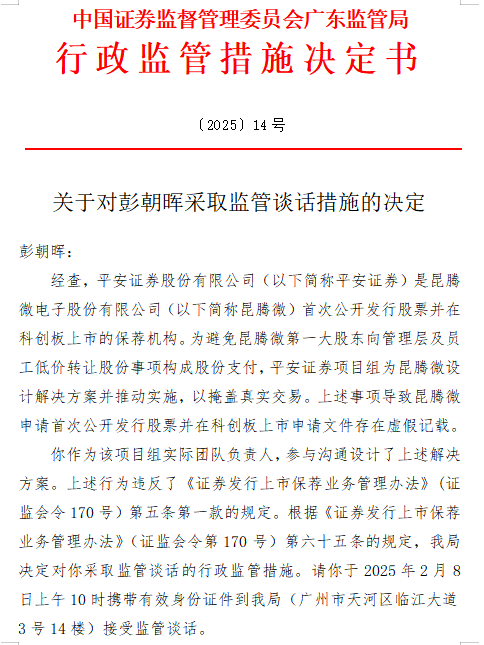1月24日,广东证监局披露3张罚单,平安证券被采取出具警示函的行政监管措施,昆腾微IPO项目组实际团队负责人彭朝晖、签字保荐代表人李广辉被采取监管谈话措施。