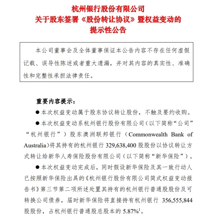 1月24日,杭州银行发布股东签署《股份转让协议》暨权益变动的提示性公告。根据公告,股东澳洲联邦银行(Commonwealth Bank of Australia)拟将其持有的杭州银行329,638,400股股份,以协议转让方式转让给新华人寿保险股份有限公司(以下简称“新华保险”)。