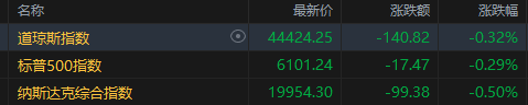 截至收盘,道琼斯指数跌0.32%,报44,424.25点;标普500指数跌0.29%,报6,101.24点;纳斯达克综合指数跌0.50%,报19,954.30点,三大指数均结束日线四连涨。
