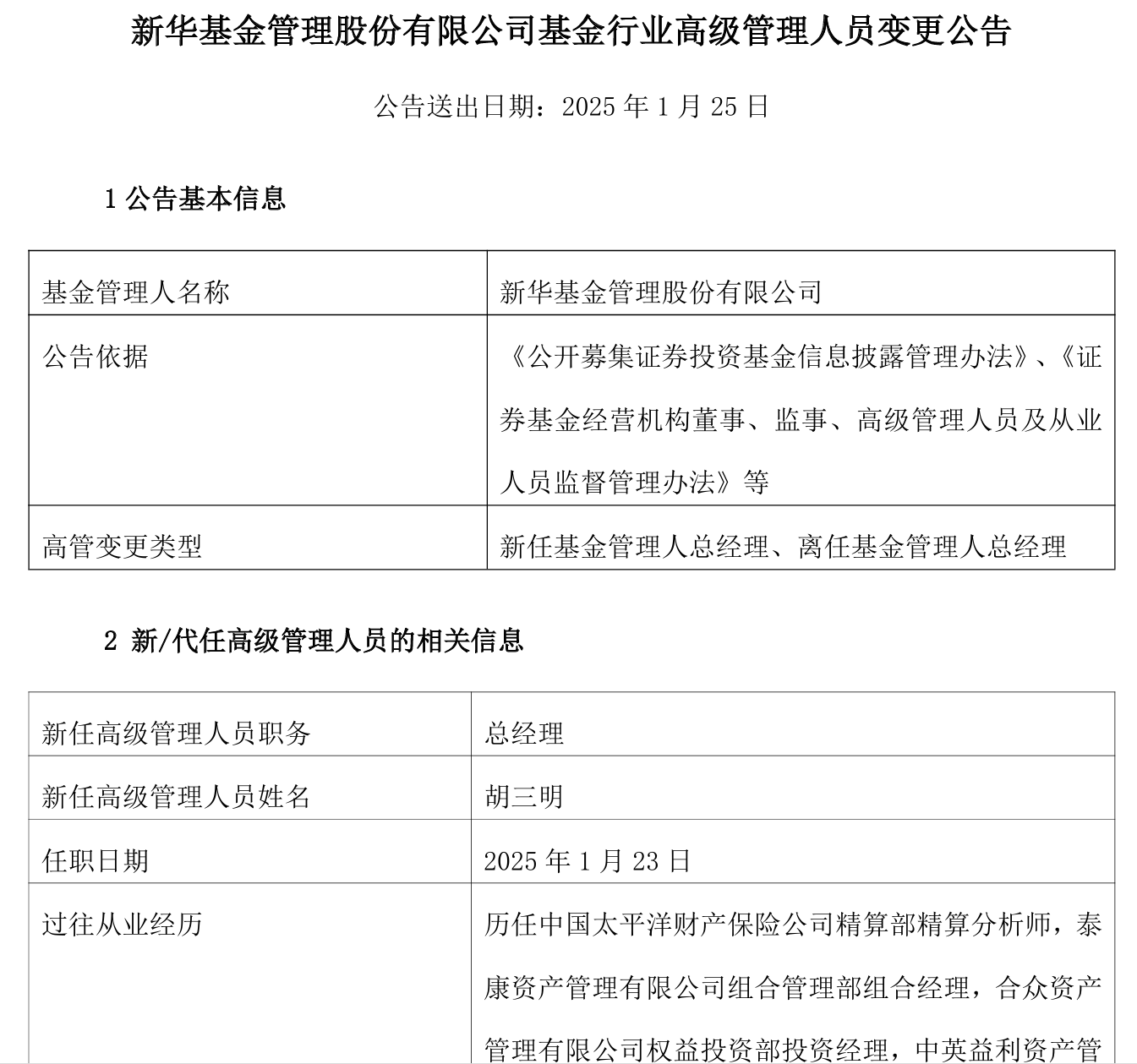 1月25日,新华基金公告称,来自控股股东恒泰证券的胡三明新任新华基金总经理,任职日期为1月23日,原总经理杨金亮因人事调动原因离任。
