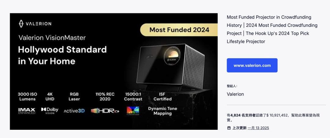 一个典型的例子就是,越来越多的出海产品和品牌依靠众筹的方式起量。在全球最大的科技众筹网站 Kickstarter 上,2024 年 Top 10 的科技项目有半数来自中国,其中唯一一个超千万美元的项目,正是来自一家深圳企业 Valerion 的 VisionMaster 三色激光投影仪。