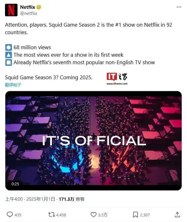 Netflix的用户数暴涨自然离不开多个爆款的连番驱动。去年12月,备受关注的《鱿鱼游戏》第二季在Netflix正式上线,首周便吸引了6800万名用户观看,播放时间更达到4.876亿小时,轻松问鼎全球非英语剧集头名。接下来《鱿鱼游戏》第二季完成榜单四连冠,累计观看量提升至1.657亿,总播放时间则录得11.878亿小时,成为Netflix第二成功的非英语剧集,仅次于破22亿小时的《鱿鱼游戏》第一季。