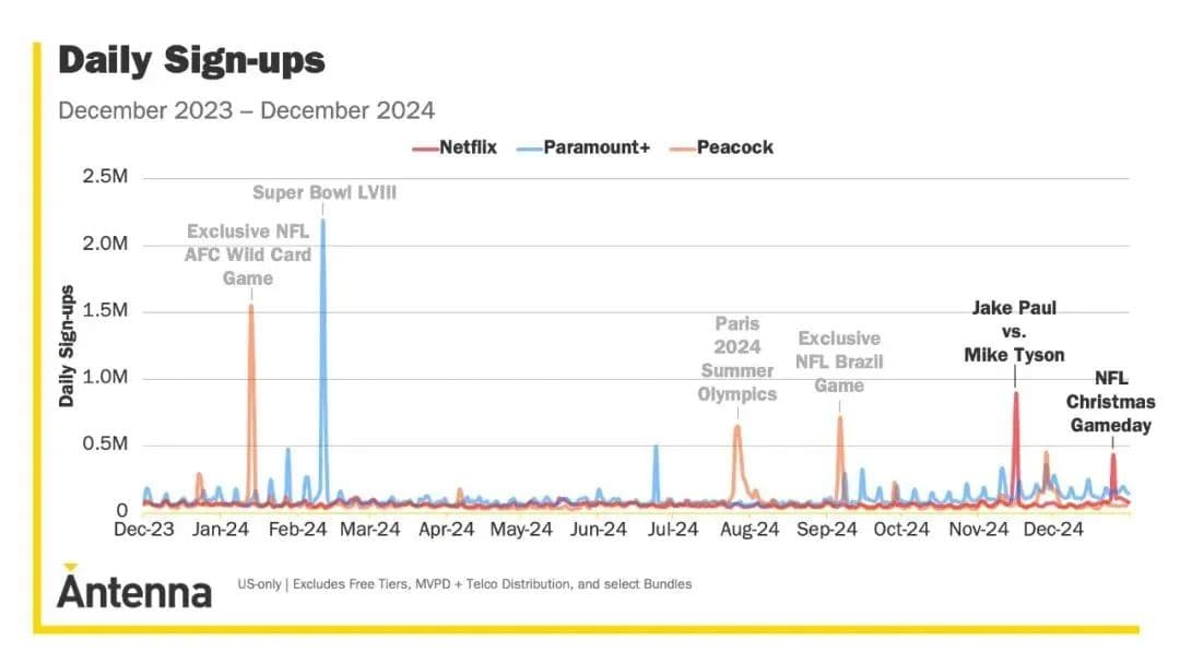 Netflix还在加码对体育直播节目的投资力度,并在第四季度收获丰厚的回报。11月16日,杰克·保罗与迈克·泰森的拳击比赛率先在Netflix登场,从开场到收场的全球平均每分钟观众人数(AMA)达到1.08亿,成为历史上实时观看量最高的体育赛事。来到12月,Netflix接力直播美国职业橄榄球大联盟(NFL)的两场圣诞日赛事,双双录得超过3千万的全球AMA,同样创下NFL比赛的观看纪录。再加上名为“碧昂丝碗”(Beyoncé Bowl)的中场秀,圣诞节NFL比赛的全球社交媒体互动数超过10亿次。有鉴于此,Netflix宣布已获得2027年和2031年国际足联女足世界杯的美国转播权,以期进一步发掘体育直播的富矿。