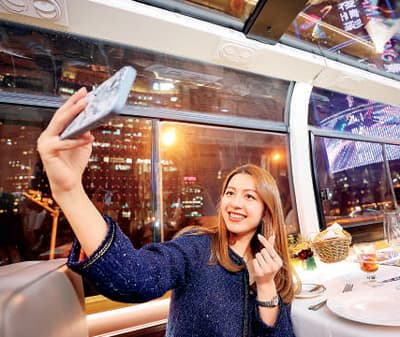 游客在北京朝阳美食观光巴士上享受休闲时光。