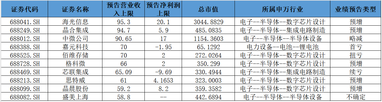 在上述338家发布业绩预告的科创板公司中,按营收上限统计,规模排名前10的公司分别为海光信息、晶合集成、中微公司、嘉元科技、佰维存储、格科微、芯联集成、思特威、晶晨股份、盛美上海。除嘉元科技外,其余9家均属半导体行业公司,营收规模上限预计均超58亿元。