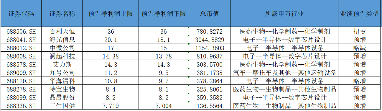按预告净利润金额来看,在现已披露业绩预告的公司中,百利天恒-U、海光信息、中微公司、澜起科技、艾力斯、九号公司、华海清科、特宝生物、晶晨股份、三生国健10家企业,净利润规模位居前十。