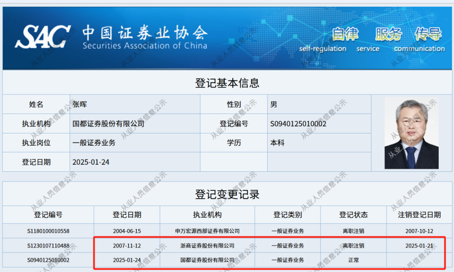 中证协公示信息显示,张晖已于1月21日从浙商证券离职注销,并于1月24日执业机构调整为国都证券。