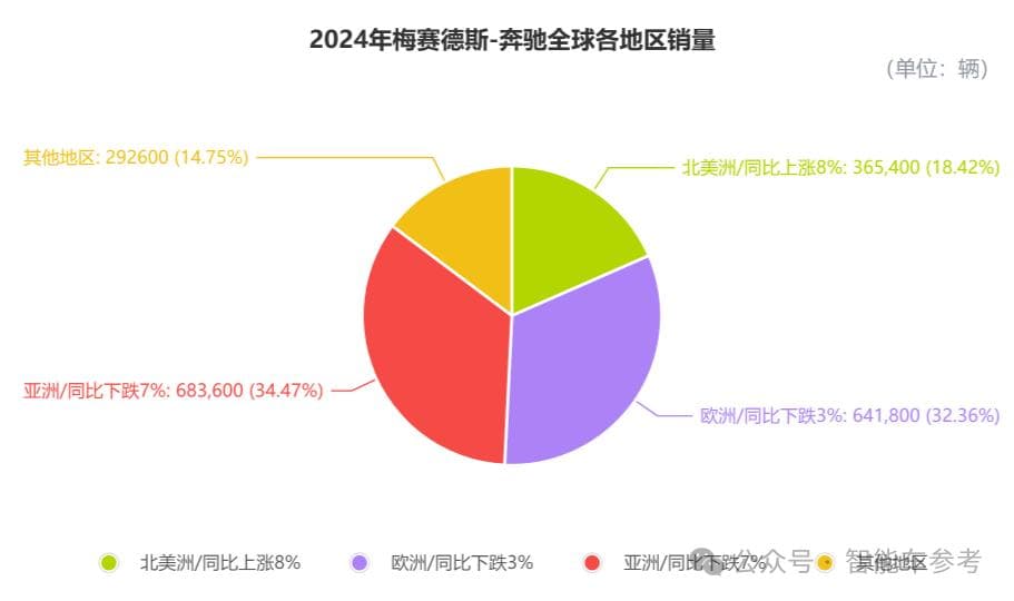 2024年,奔驰在中国的销量为68.36万辆,同比下滑7%;欧洲市场销售64.18万辆,同比下滑3%,其中德国跌幅最大,卖出了21.35万辆,同比下跌9%。