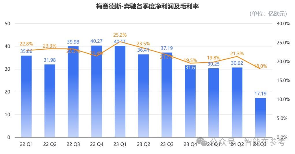 再结合第三季度业绩,公司净利润腰斩,毛利率降到三年来的最低水平,奔驰不得不两次下调了全年利润率目标,汽车业务的调整后利润率从11%下调到7.5%-8.5%。