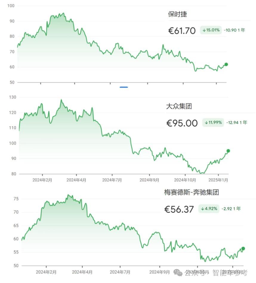 一年来,奔驰股价已下跌4.9%,大众和保时捷股价均跌破两位数,分别下跌12.9%和10.9%。
