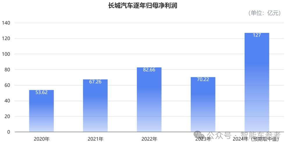 长城汽车预计,2024年公司归母净利润为124~130亿元,同比增加76.60%~85.14%;归母扣非净利润为94~100亿元,同比增加94.47%~106.88%。