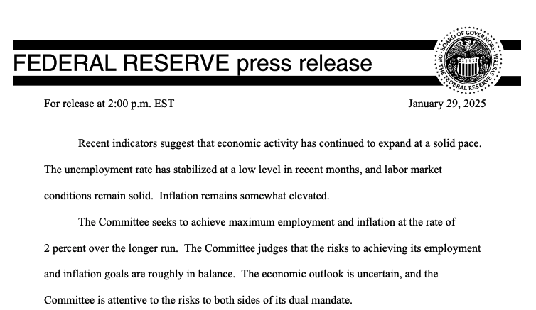 财联社1月30日讯(编辑 史正丞)北京时间周四凌晨3点,美联储公布2025年的第一份利率决议。
