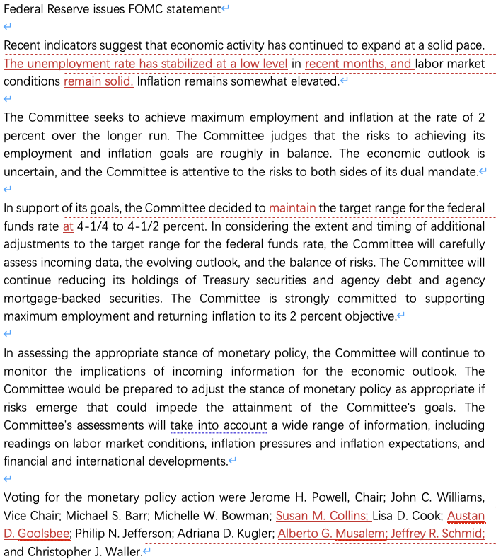 为支持这一目标,委员会决定将联邦基金利率的目标区间维持在4.25%至4.5%之间。在考虑进一步调整联邦基金利率目标区间的幅度和时机时,委员会将仔细评估最新数据、不断变化的经济前景以及风险的平衡。委员会将继续减少其国债、政府机构债务及政府机构抵押贷款支持证券的持有量。委员会坚决致力于支持最大就业,并将通胀率恢复到2%的目标。