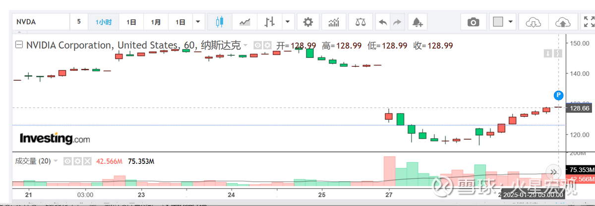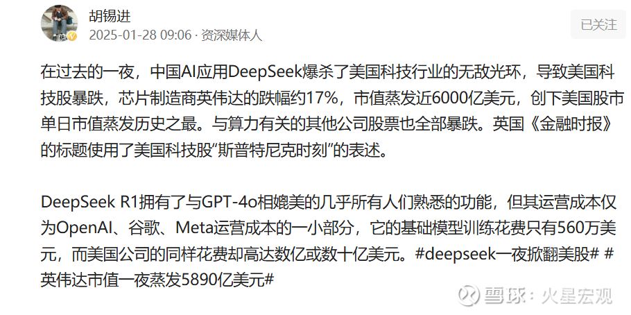 1月28日,中国最红的媒体人胡锡进称,在过去的一夜,中国AI应用DeepSeek爆杀了美国科技行业的无敌光环,导致美国科技股暴跌,芯片制造商英伟达的跌幅约17%,市值蒸发近6000亿美元,创下美国股市单日市值蒸发历史之最。与算力有关的其他公司股票也全部暴跌。