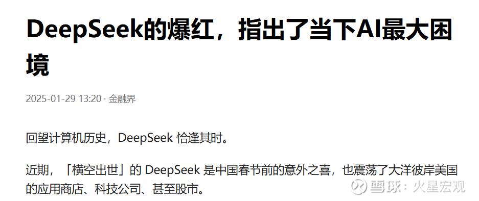 这两天,中国AI应用DeepSeek的风头无两,在所有中文平台霸榜。对DeepSeek的溢美之声,不绝于口,夸到词穷。什么DeepSeek让英伟达瑟瑟发抖,什么DeepSeek比ChatGPT更好,什么爆杀了美国科技行业的无敌光环,什么彻底终结美国对高科技产业的垄断地位……..。