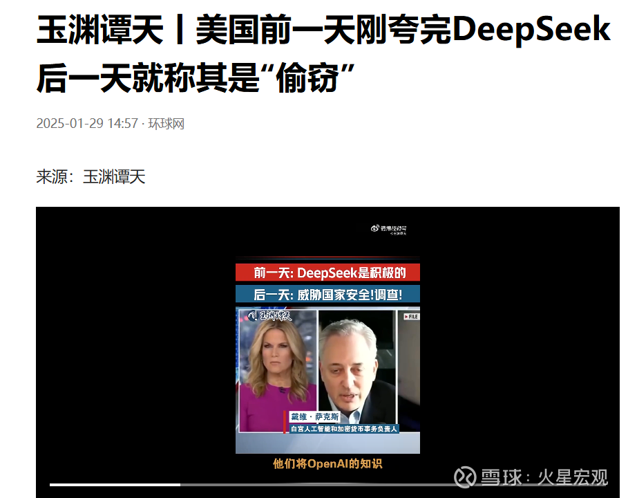 huang'qiu'w在报道这一消息时,直接称“美国前一天刚夸完DeepSeek后一天就称其是偷窃”。