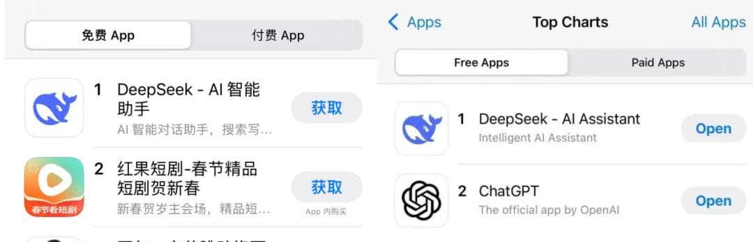 DeepSeek应用登顶苹果中国地区和美国地区应用商店免费App下载排行榜,在美区下载榜上超越ChatGPT。这也是首次中国应用能同期在中国和美区苹果App Store占据第一位。