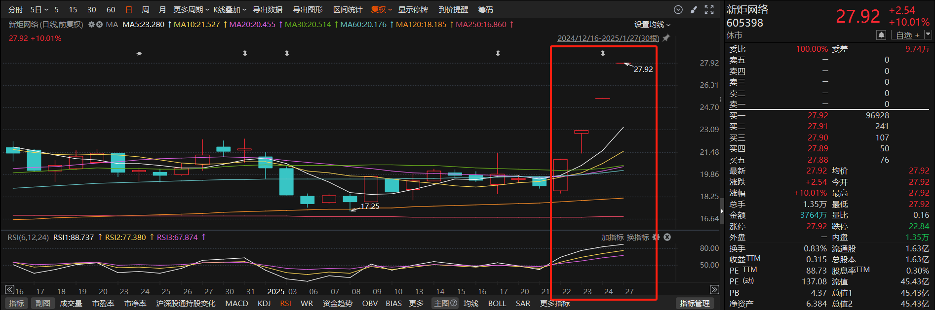 财联社1月31日讯(编辑 宣林)AI智能体概念延续强势上涨,截至节前最后一个交易日收盘,布局IT运维智能体业务的新炬网络斩获4连板,构建财税AI Agent智能体的金财互联实现2连板,与智谱合作开发AI Agent智能体的视觉中国录得2连板,初步完成智能体工具链(PanAgent)的普联软件20CM涨停,通过召唤小艺实现智能体服务的彩讯股份涨超15%。