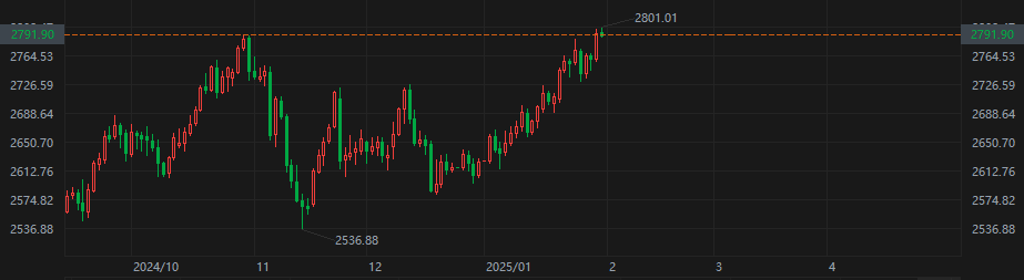 财联社1月31日讯(编辑 赵昊)周五(1月31日)欧洲时段,现货黄金价格短暂突破了2800关口,将历史记录刷新至每盎司2801.01美元。